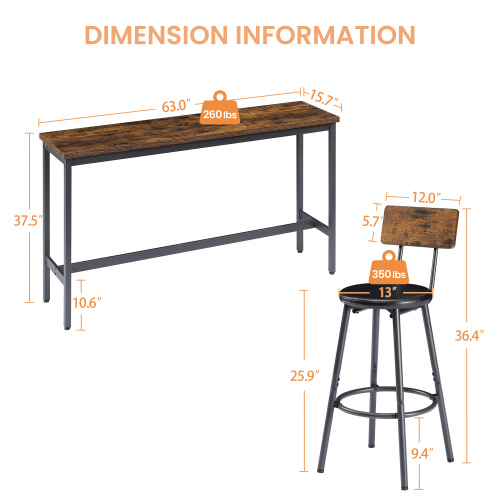 Product Name: Long Bar Table Set with 3 PU Upholstered Bar Stools, Industrial Bar Table and Chairs for Kitchen Breakfast Table, Living Room, Banquet Hall, Rustic Brown and Black, 63″L x15.7"W x 37.5"H